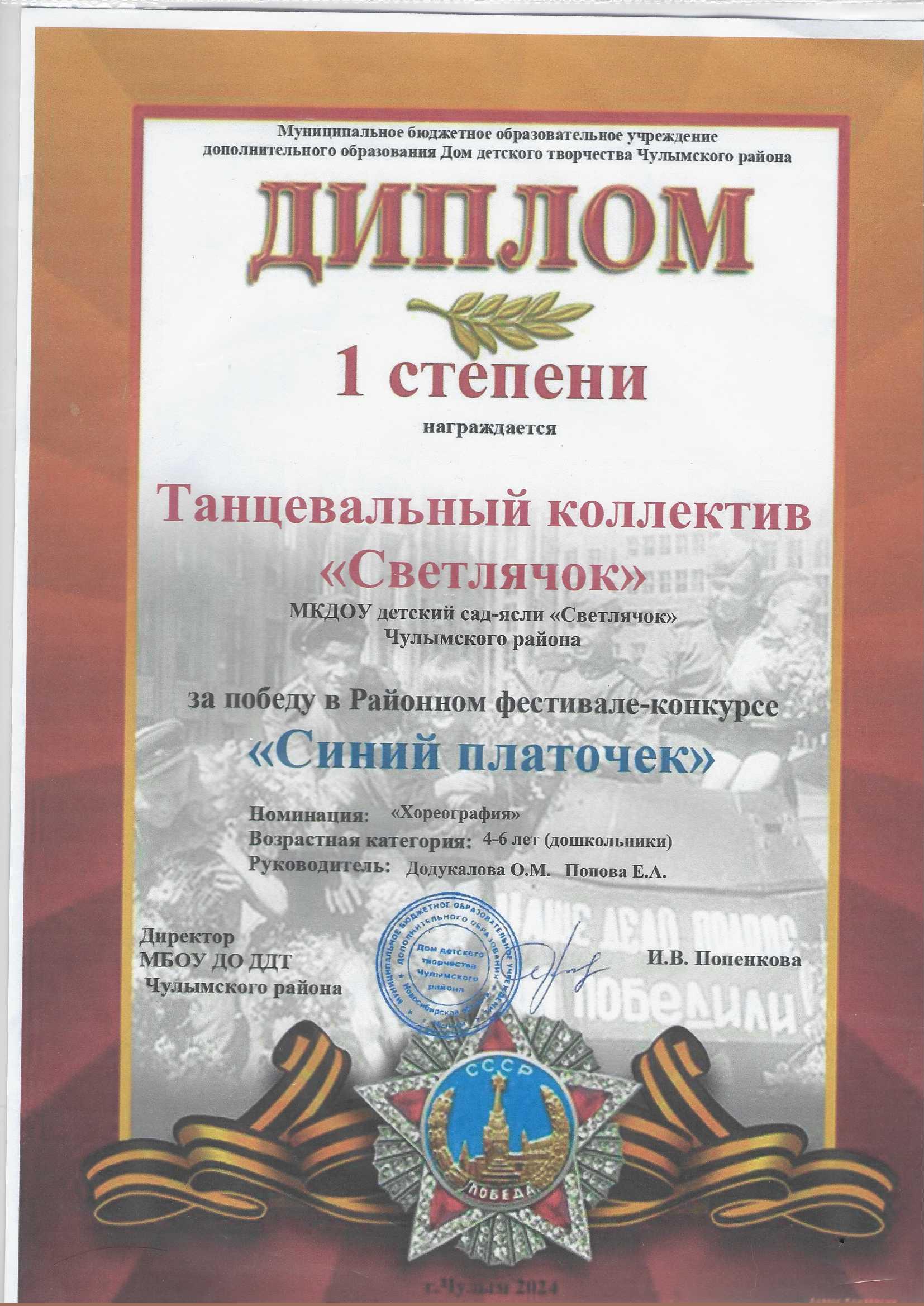 Диплом I степени за победу в Районном фестивале-конкурсе "СИНИЙ ПЛАТОЧЕК"