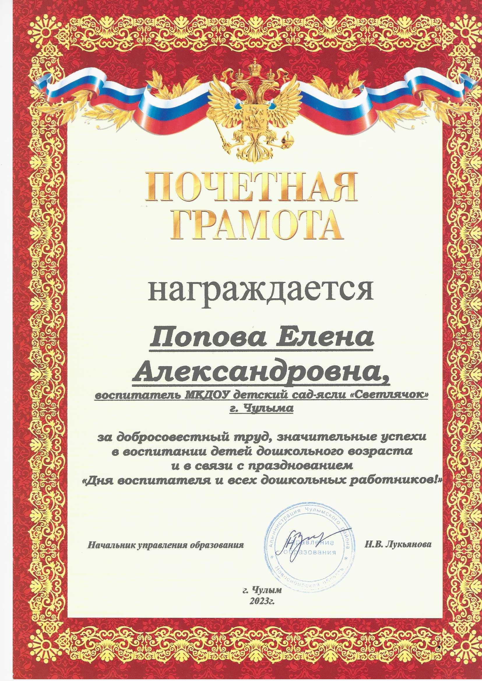 Почетная грамота за добросовестный труд, значительные успехи в воспитании детей дошкольного возраста