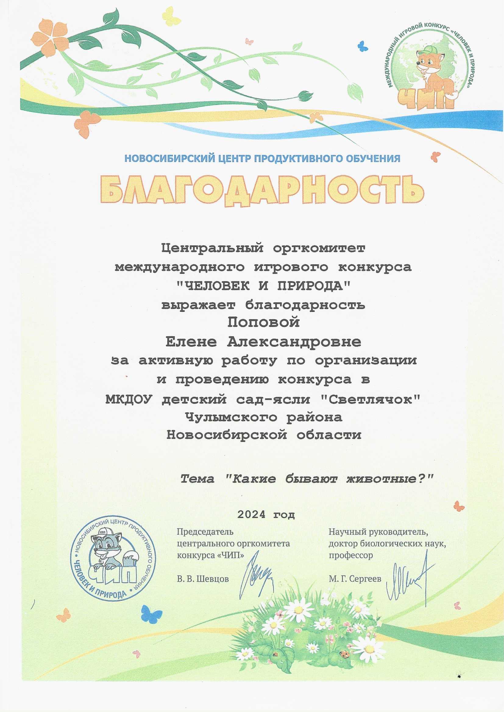 Благодарность за активную работу по организации и проведению конкурса "ЧЕЛОВЕК И ПРИРОДА" 2024г.