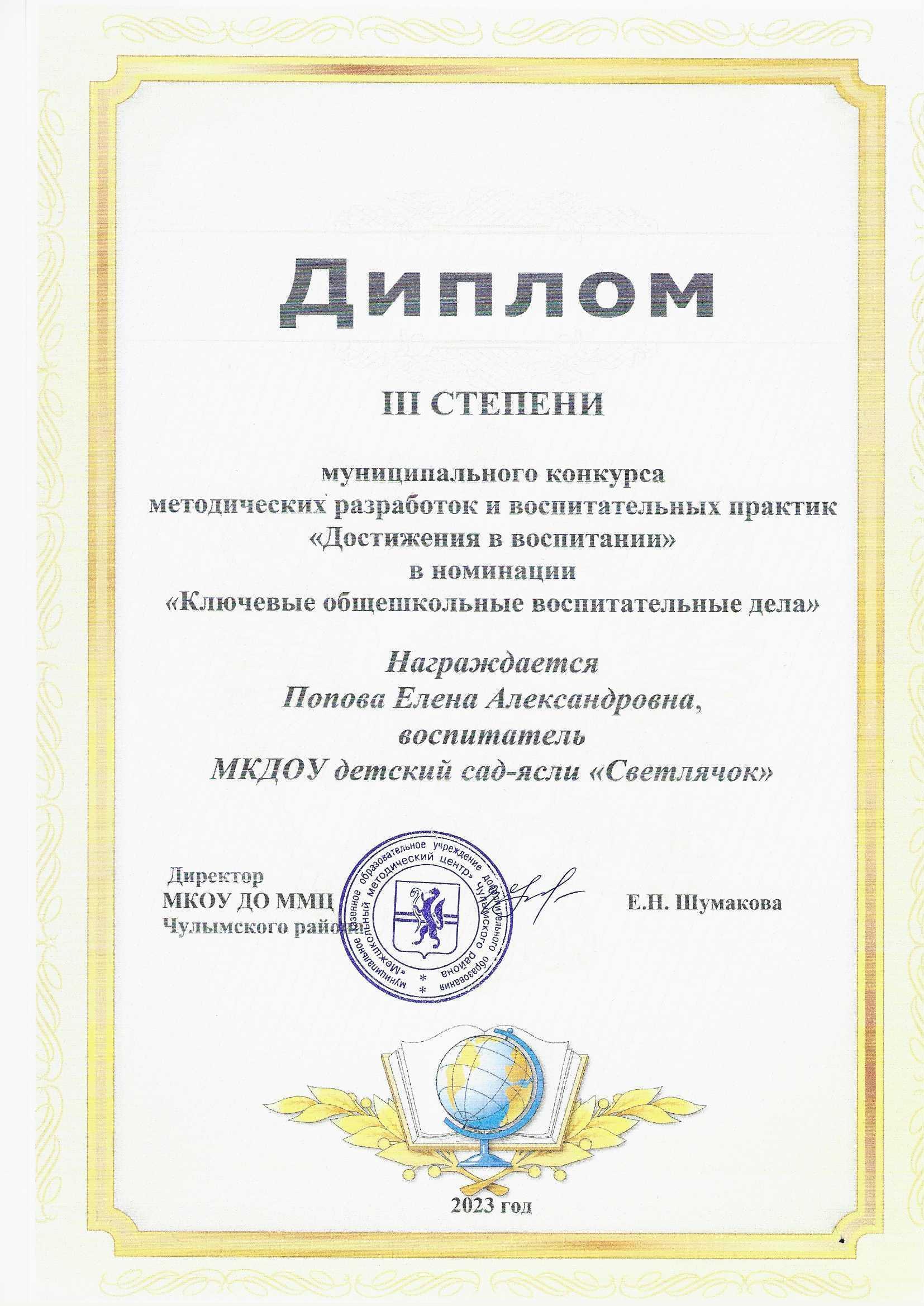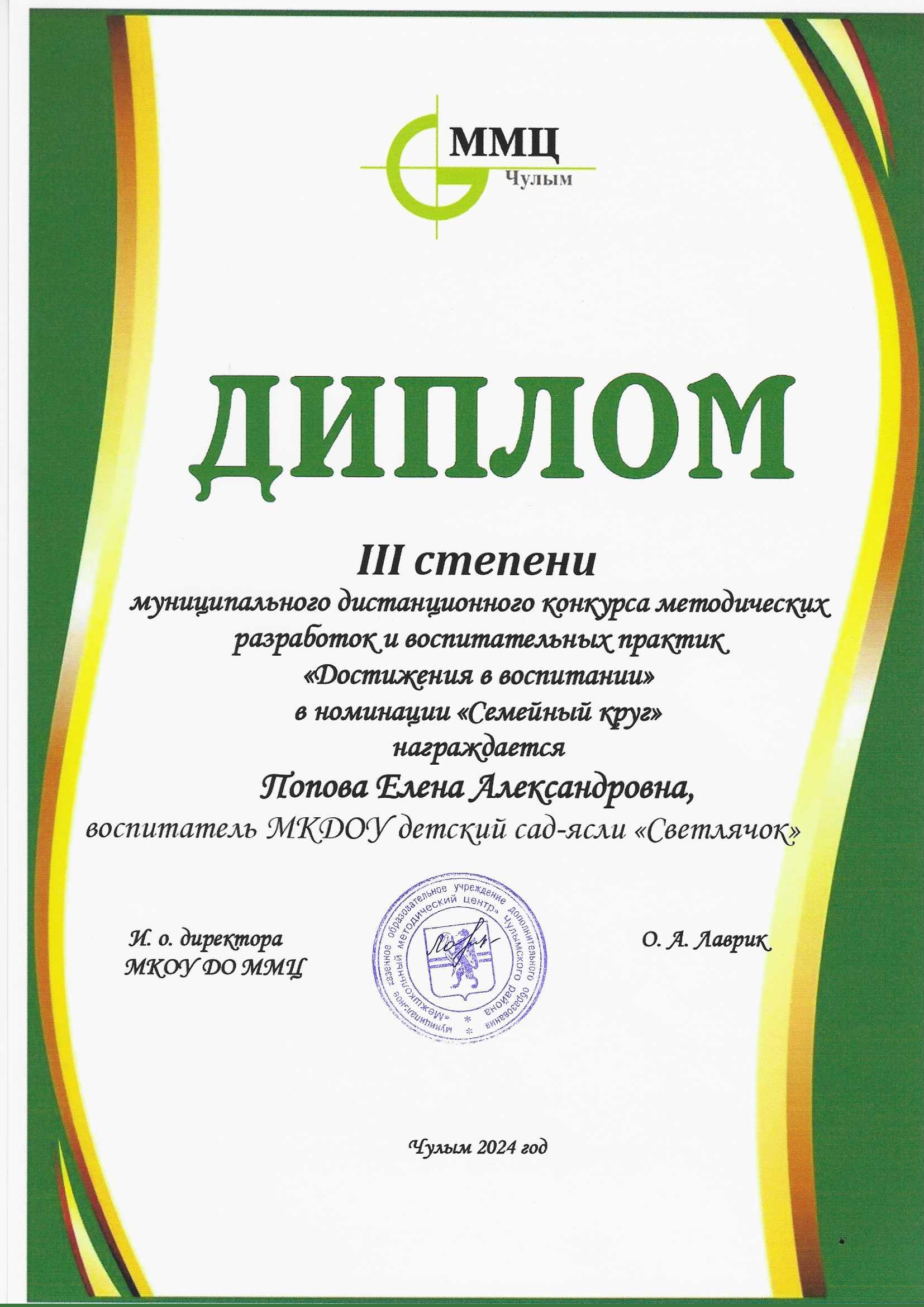 Диплом III степени муниципального дистанционного конкурса методических разработок и воспитательных практик "Достижения в воспитании" в номинации "Семейный круг"