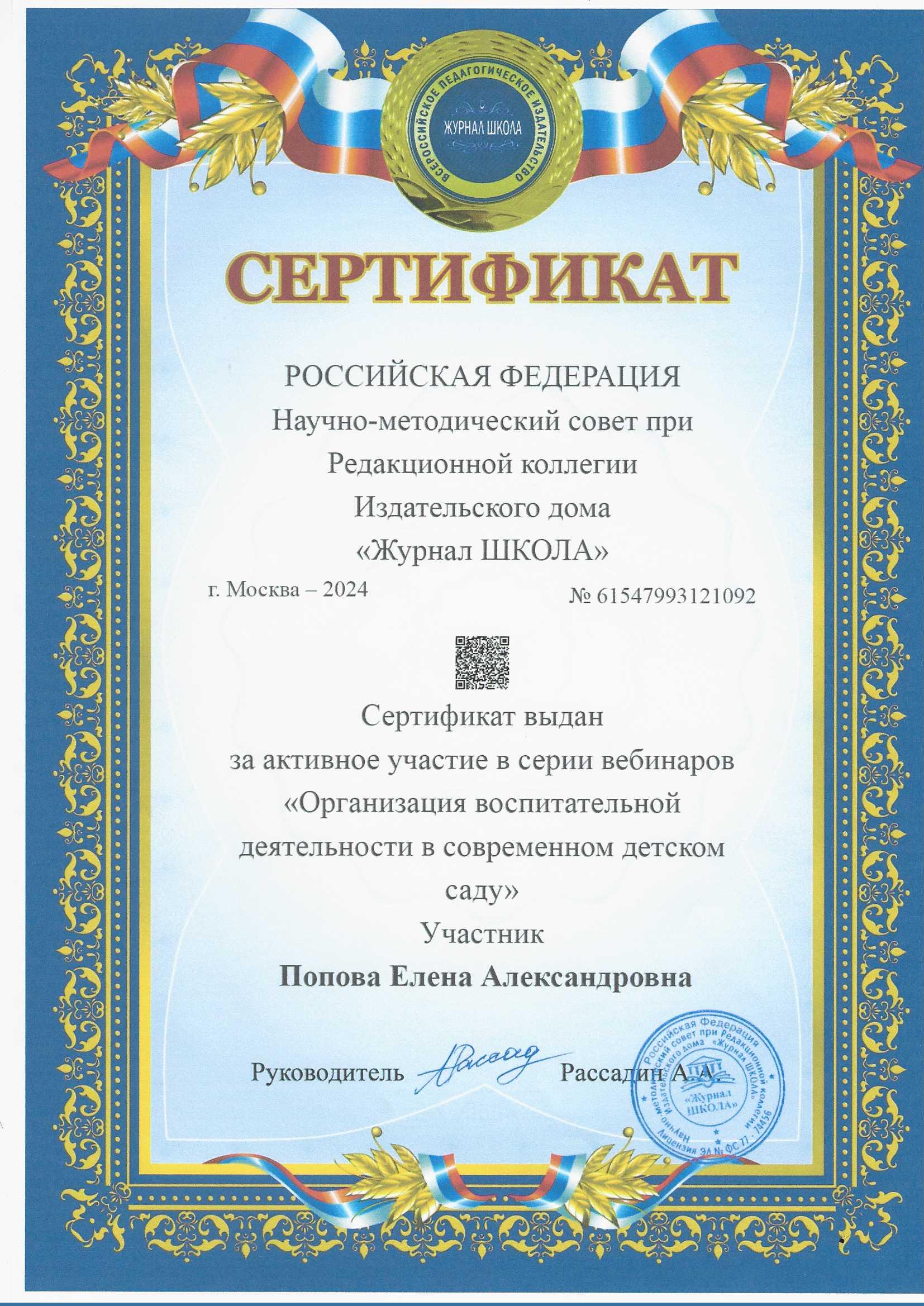 Сертификат за активное участие в серии вебинаров "Организация воспитательной деятельности в современном детском саду"