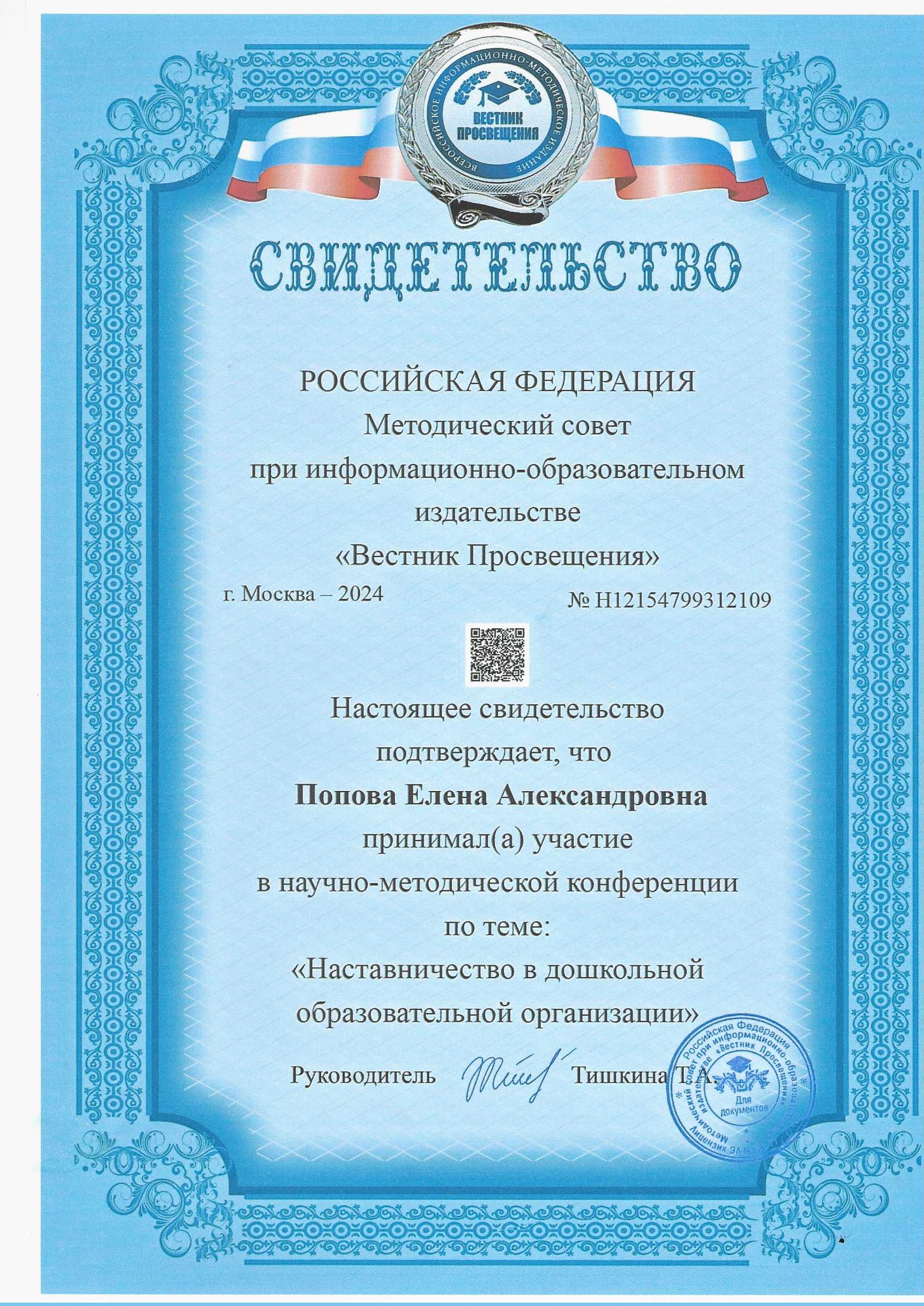 Свидетельство участие в научно-методической конференции по теме: "Наставничество в дошкольной образовательной организации"