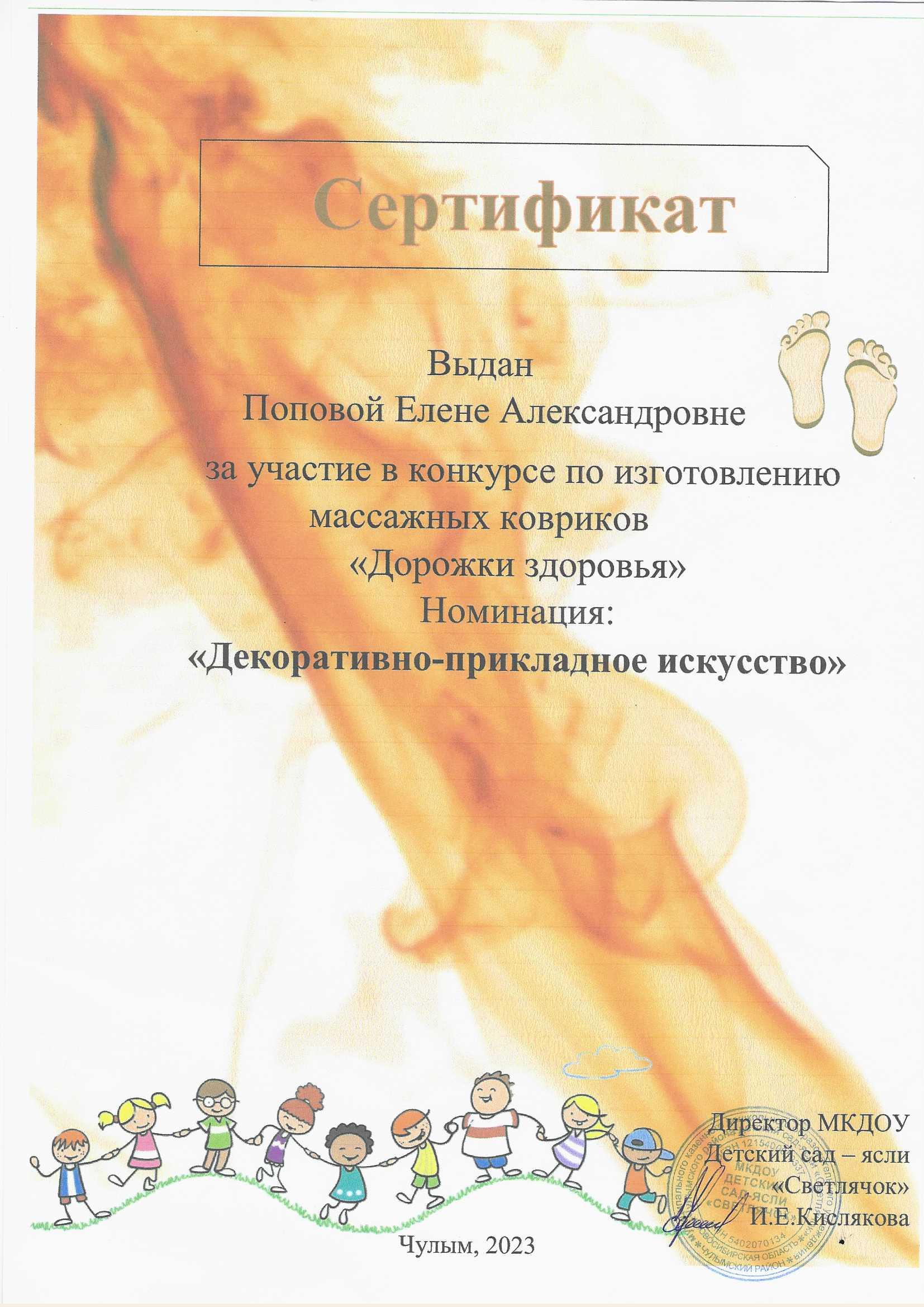 Сертификат за участие в конкурсе по изготовлению массажных ковриков "Дорожки здоровья"