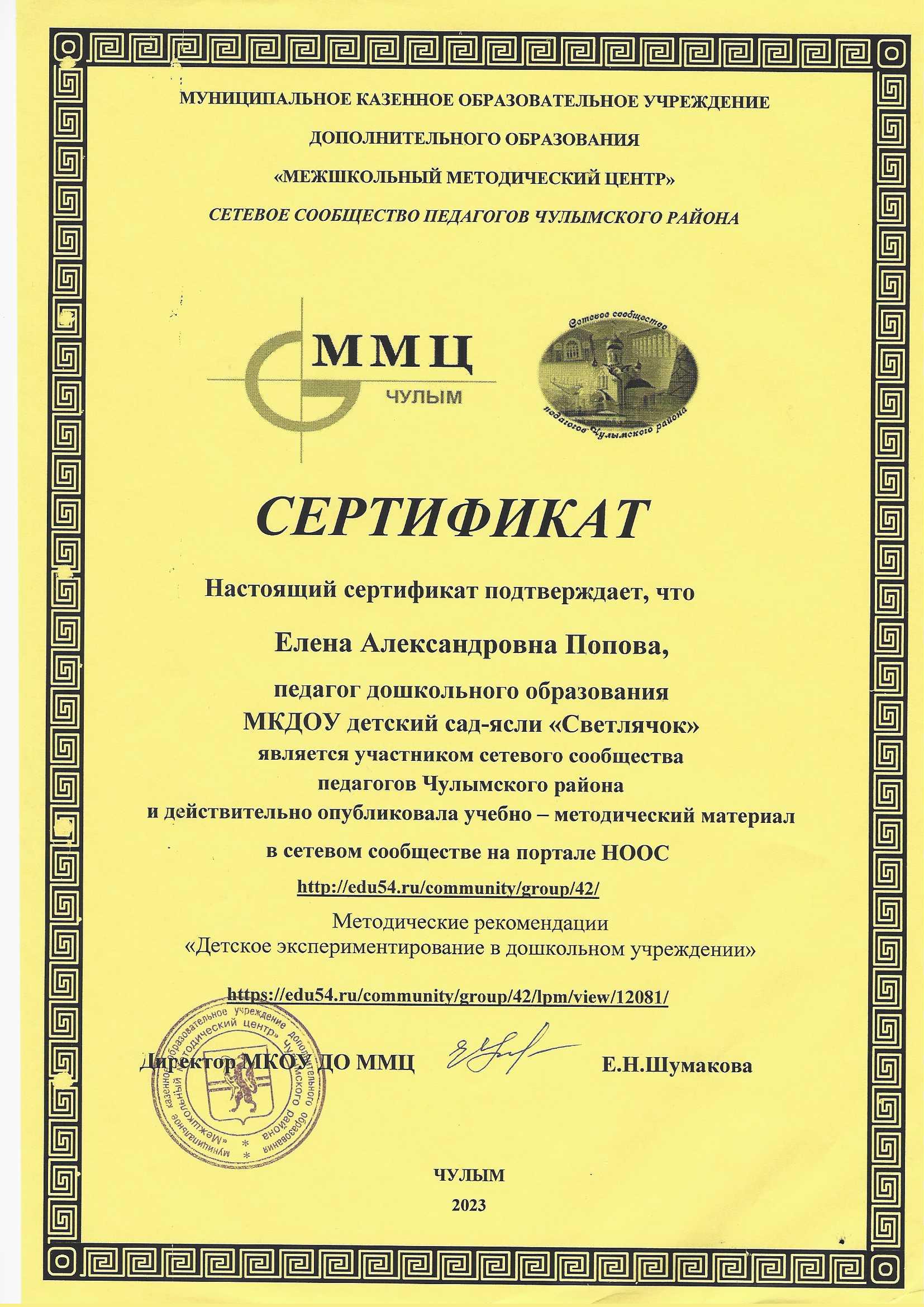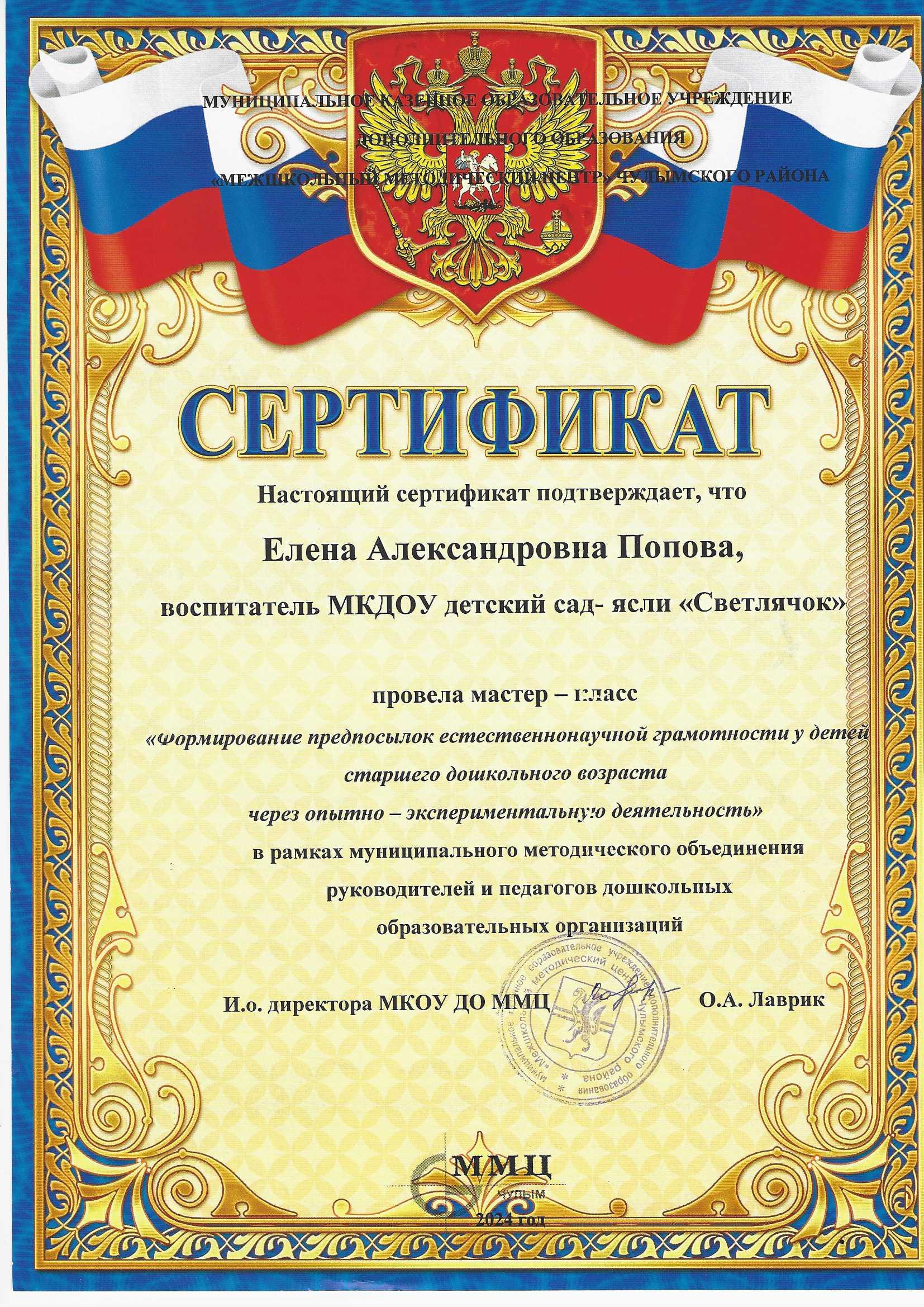 Сертификат о проведении мастер-класса "Формирование предпосылок естественнонаучной грамотности у детей старшего дошкольного возраста через опытно-экспериментальную деятельность" в рамках ММО