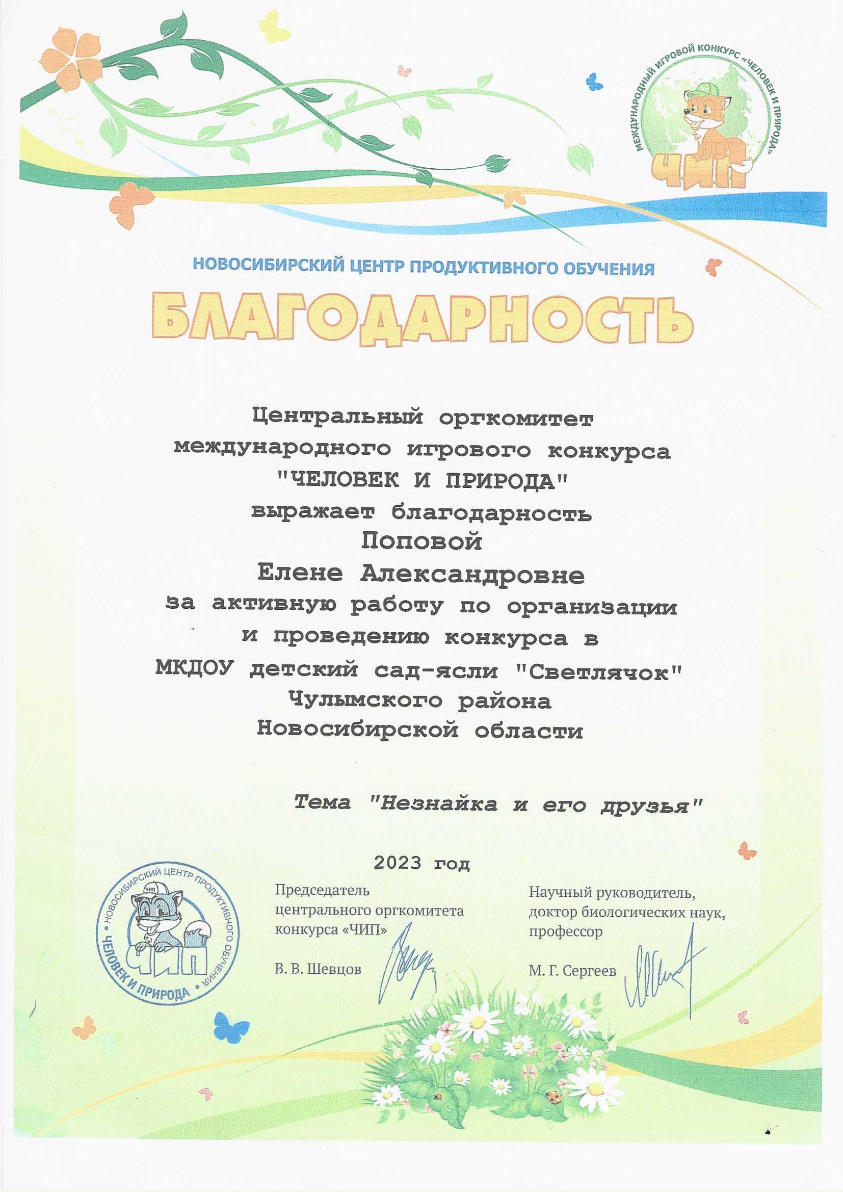 Благодарность за активную работу по организации и проведению конкурса "ЧЕЛОВЕК И ПРИРОДА" 2023г.