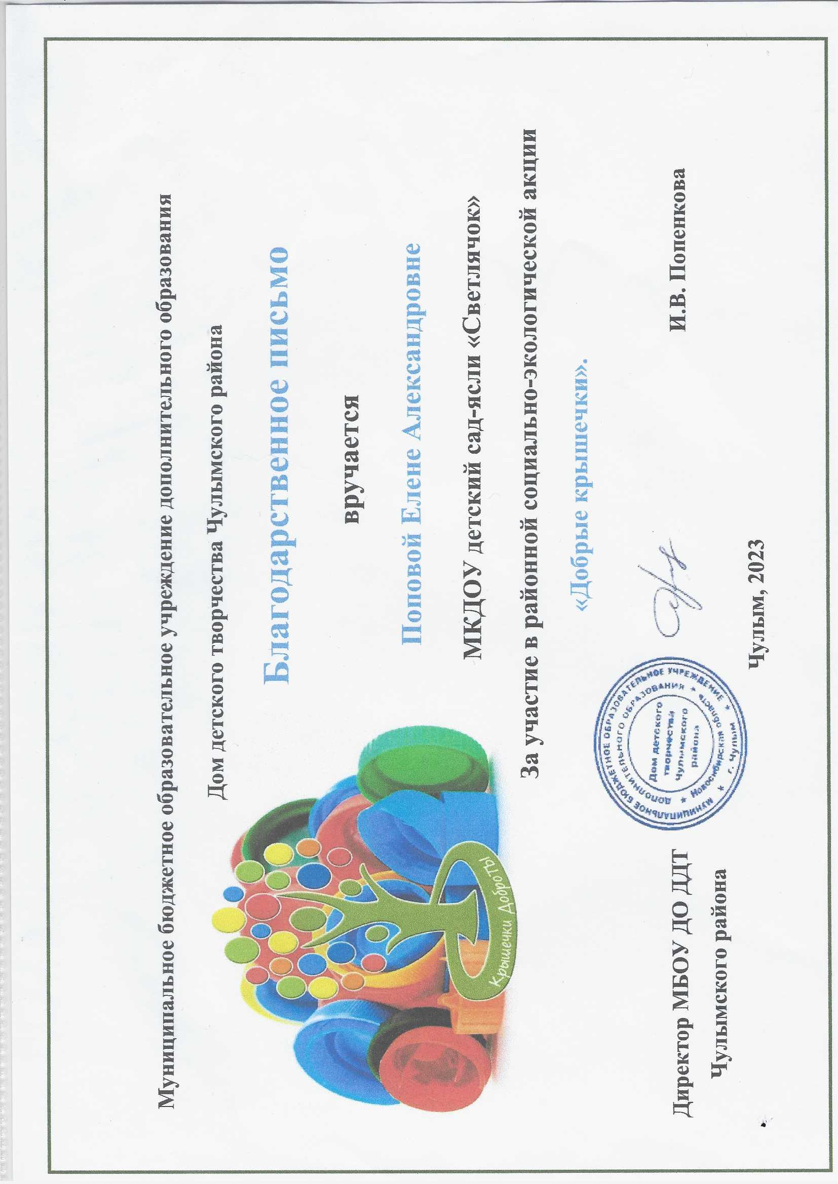 Благодарственное письмо за участие в районной социально-экологической акции "Добрые крышечки"
