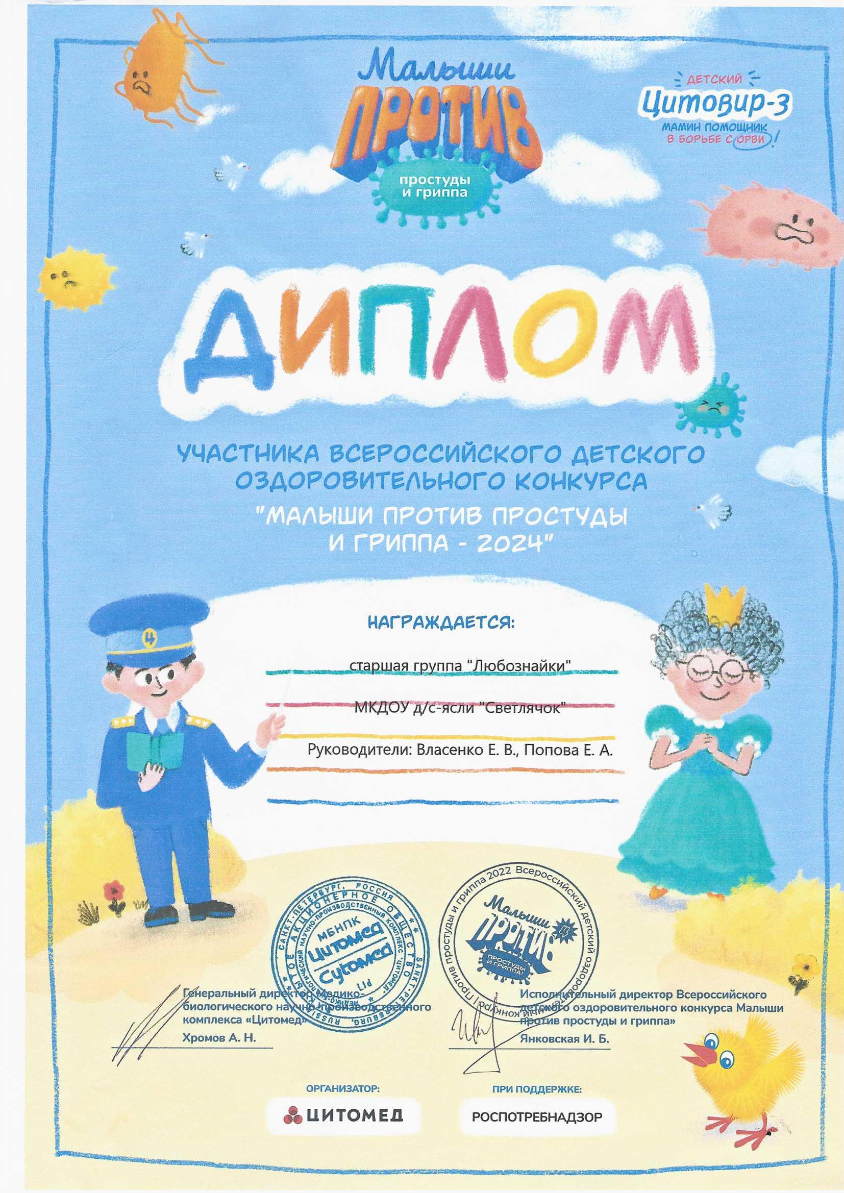 Диплом участника всероссийского детского оздоровительного конкурса "Малыши против простуды и гриппа - 2024"