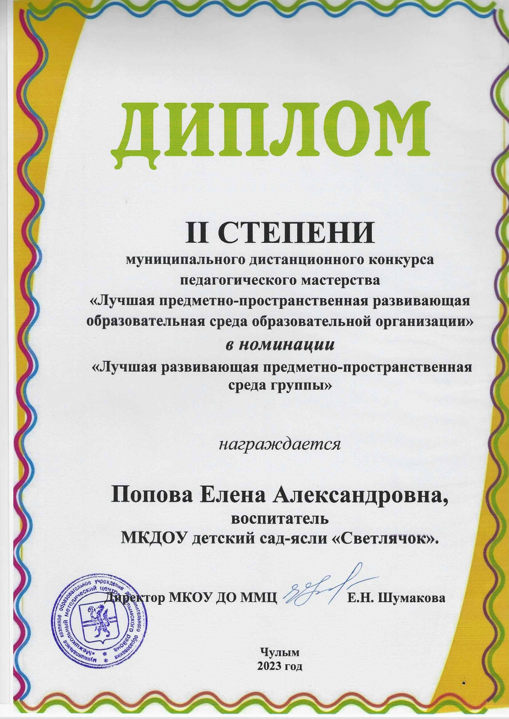 Диплом II степени муниципального дистанционного конкурса педагогического мастерства "Лучшая предметно-пространственная развивающая образовательная среда"