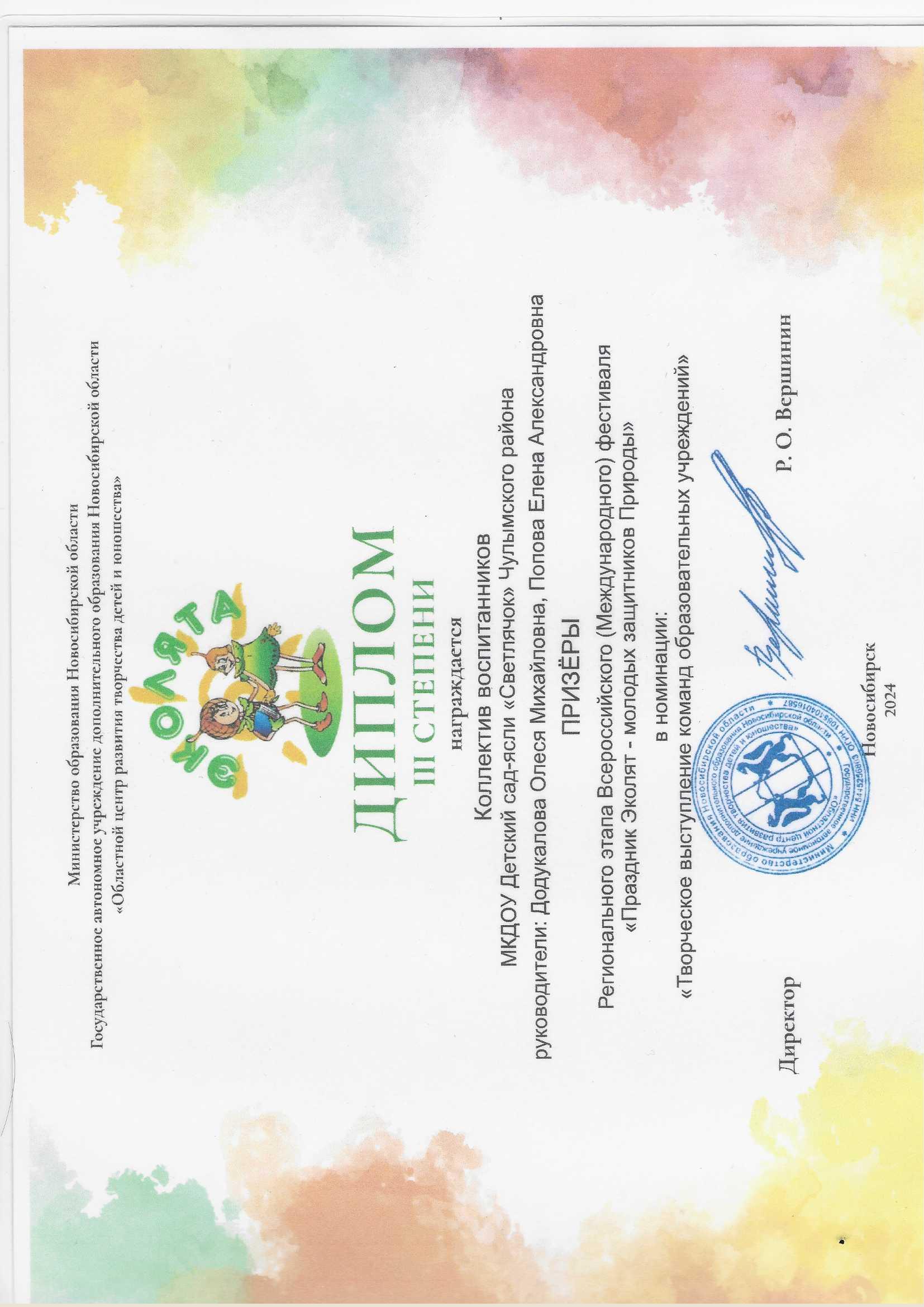 Диплом III степени ПРИЗЁРЫ Регионального этапа Всероссийского (Международного) фестиваля "Праздник Эколят - молодых защитников природы"