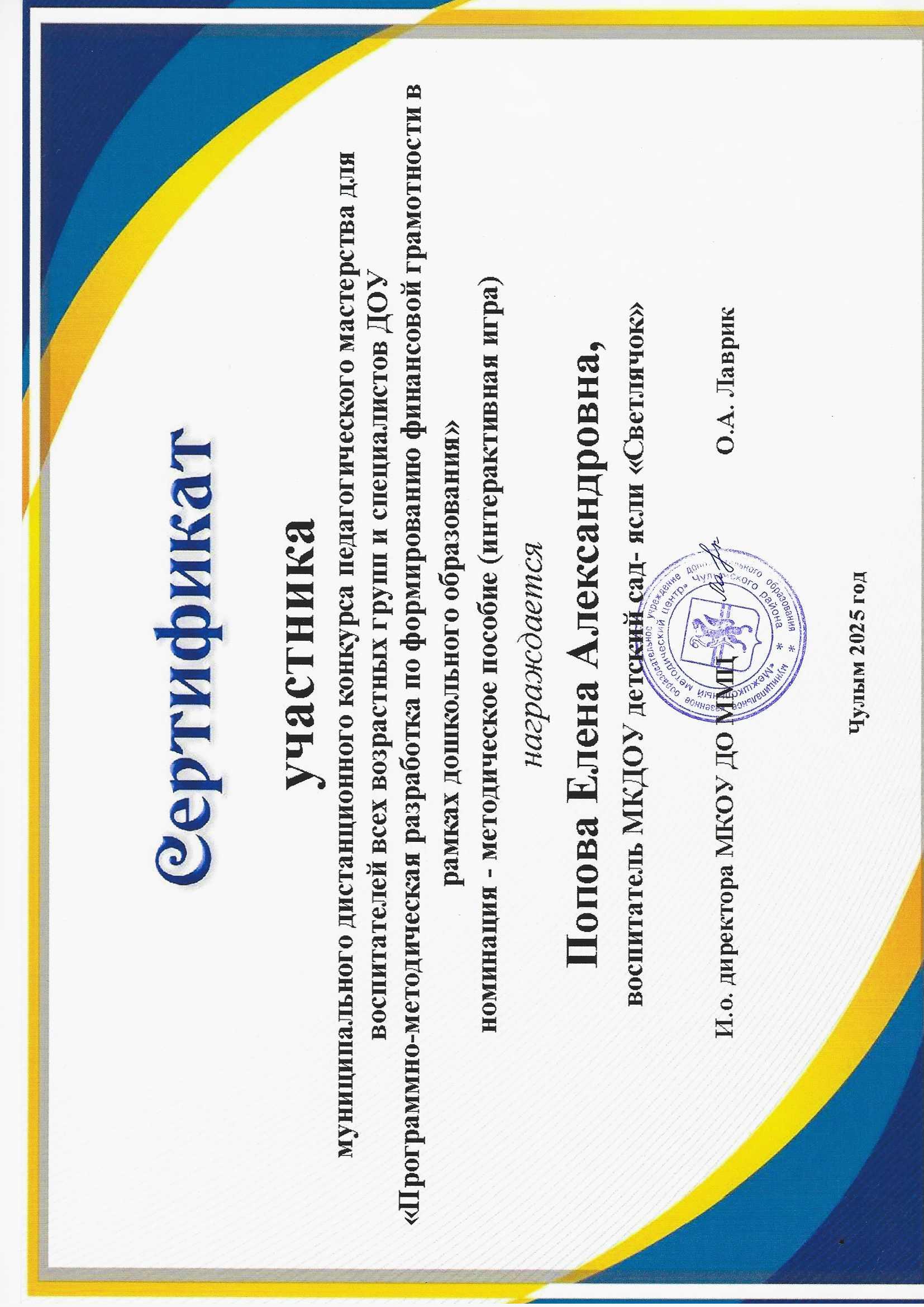 Сертификат участника муниципального дистанционного конкурса педагогического мастерства "Программно-методическая разработка по формированию финансовой грамотности в рамках дошкольного образования"