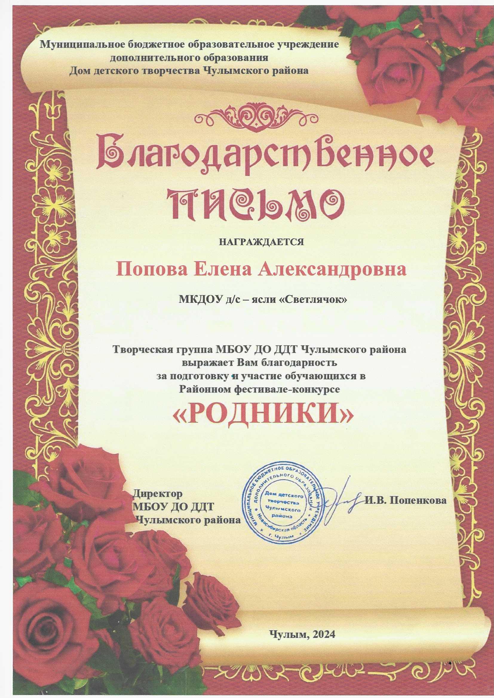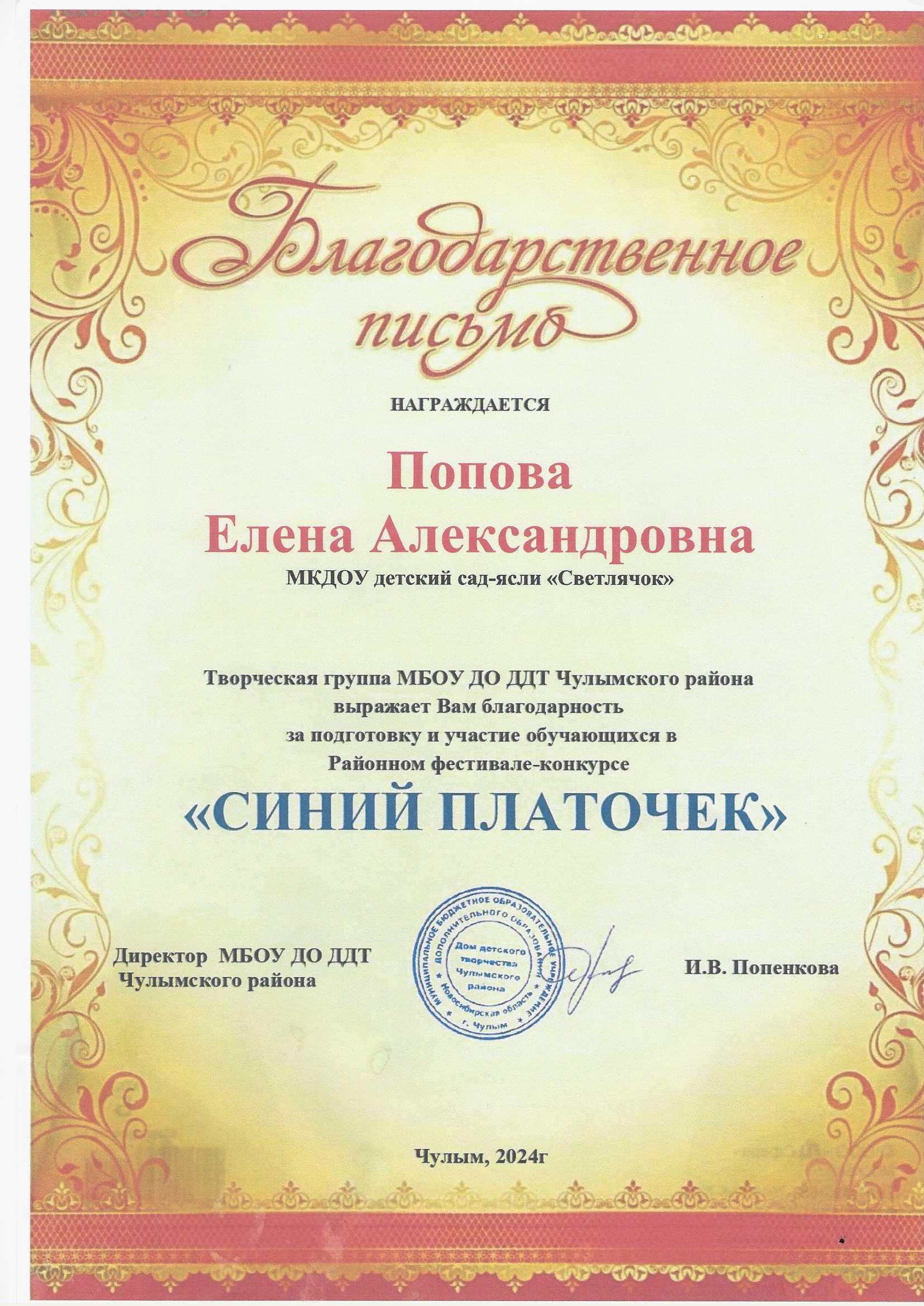 Благодарственное письмо за подготовку и участие обучающихся в Районном фестивале-конкурсе "СИНИЙ ПЛАТОЧЕК" 2024г.