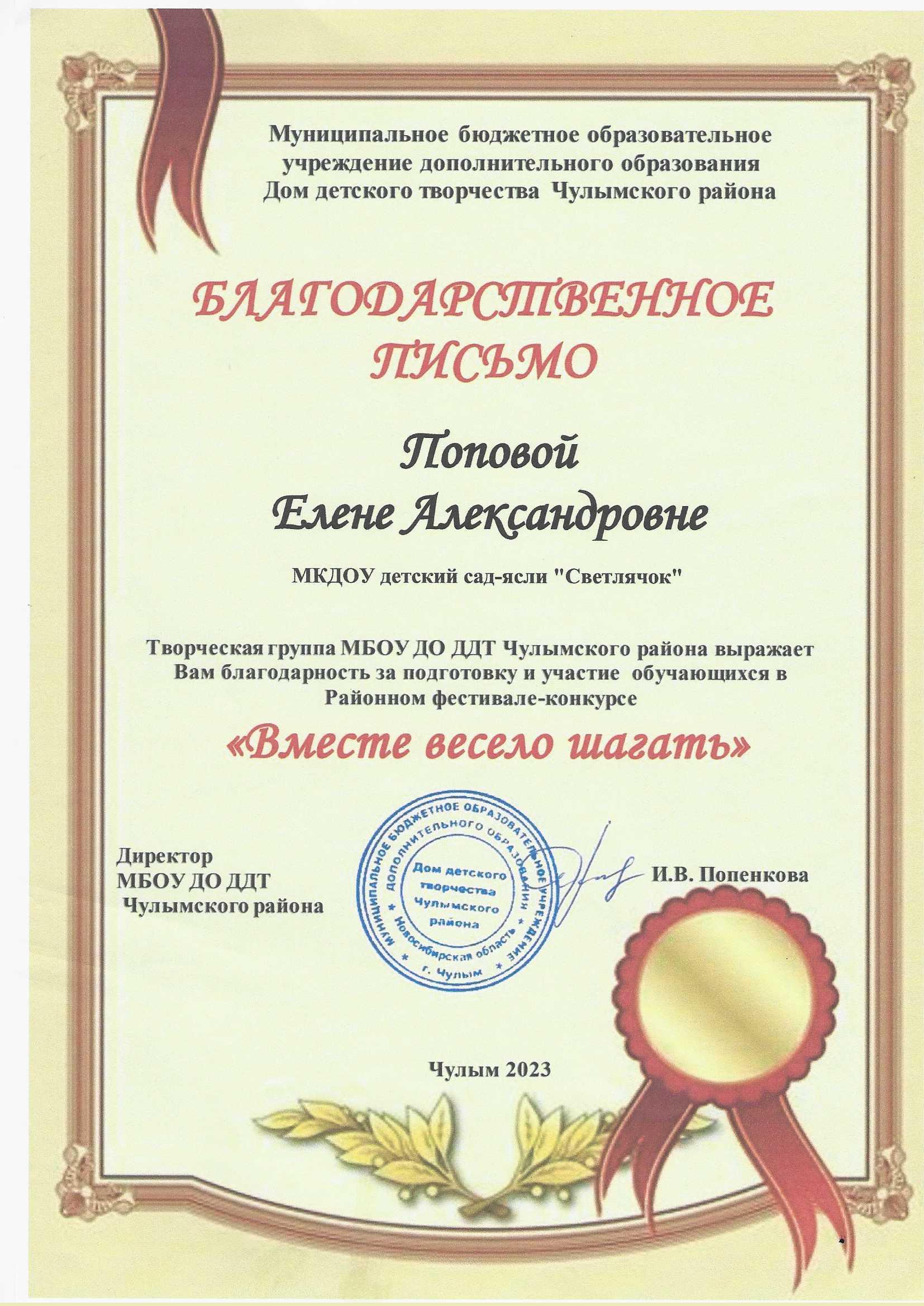 Благодарственное письмо за подготовку и участие обучающихся в Районном фестивале-конкурсе "Вместе весело шагать"