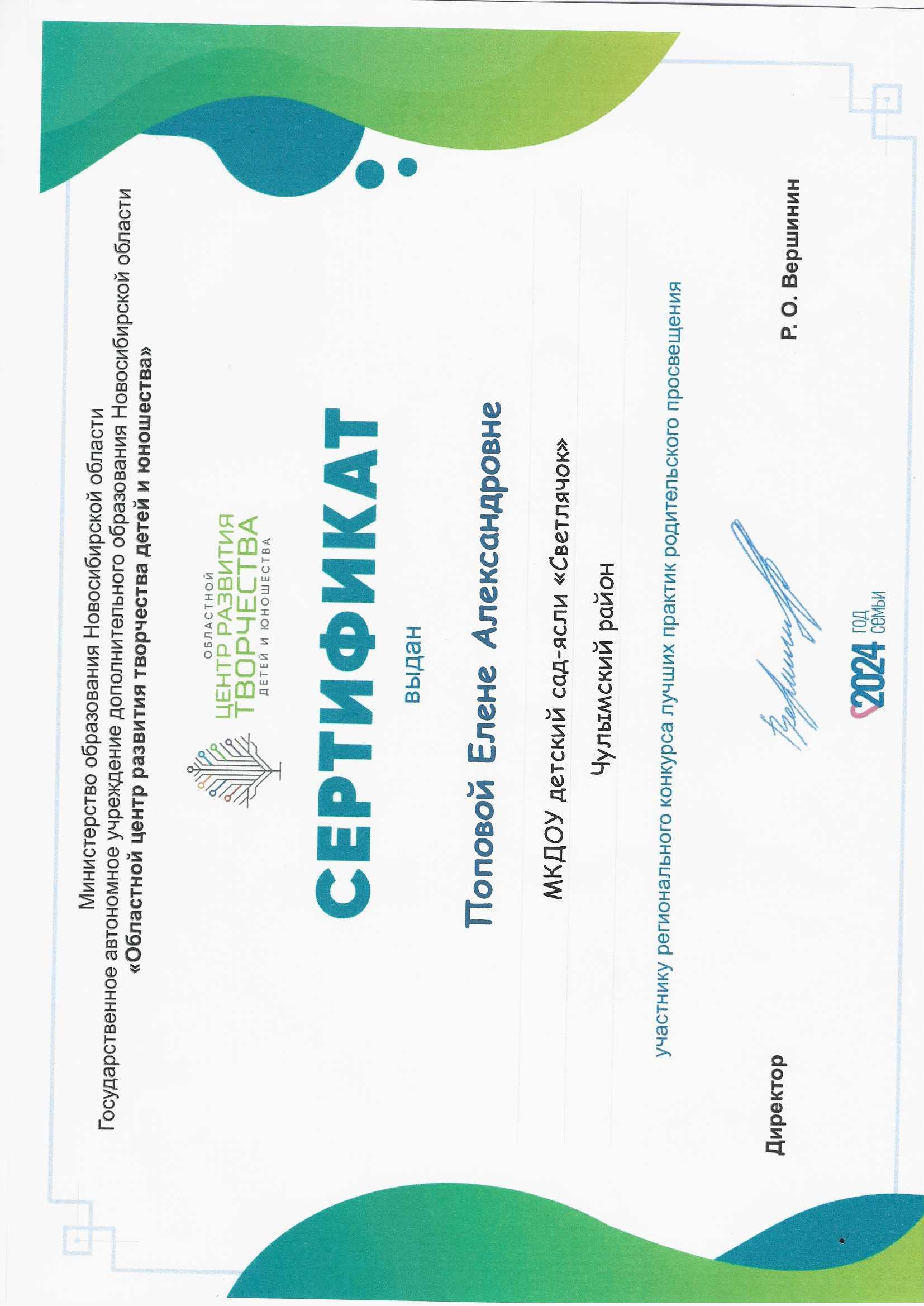 Сертификат за участие в региональном конкурсе лучших практик родительского просвещения
