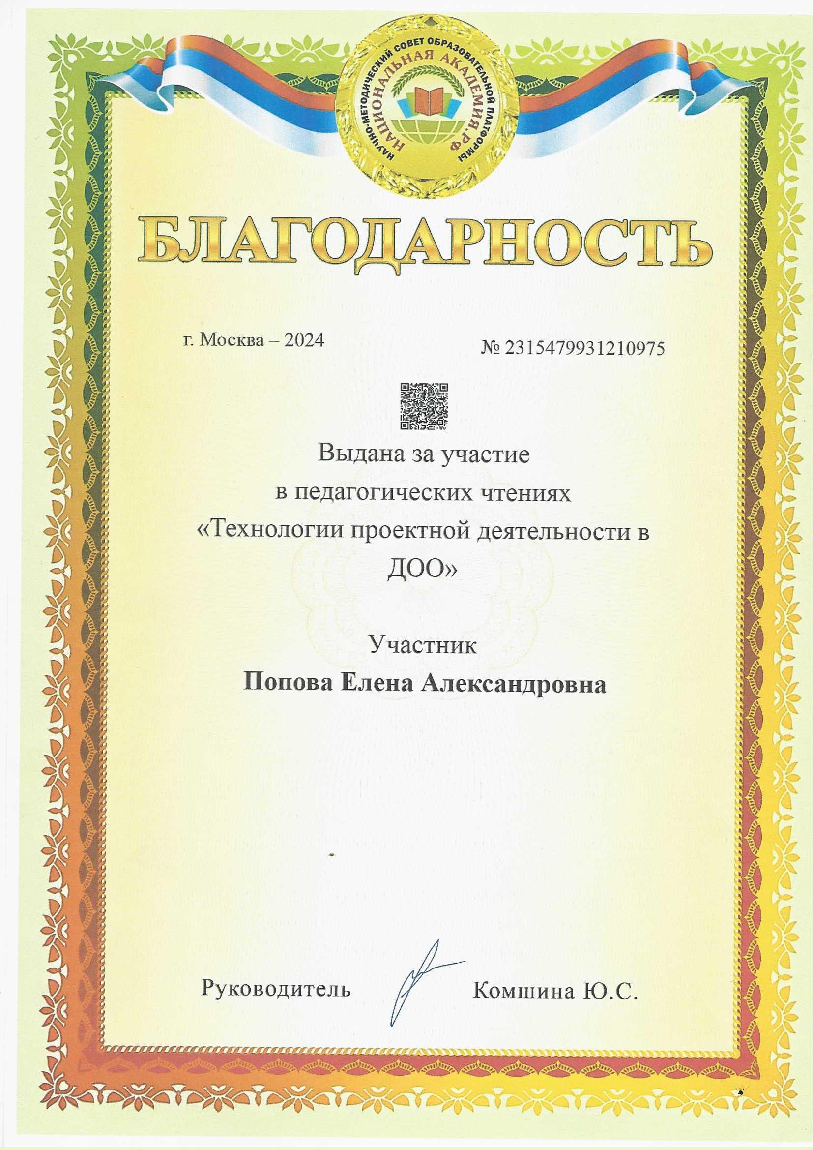 Благодарность за участие в педагогических чтениях "Технологии проектной деятельности в ДОО"
