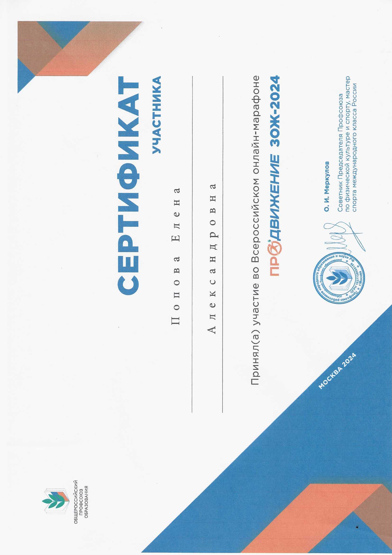 Сертификат за участие во Всероссийском онлайн-марафоне ПРОДВИЖЕНИЕ ЗОЖ - 2024 г.