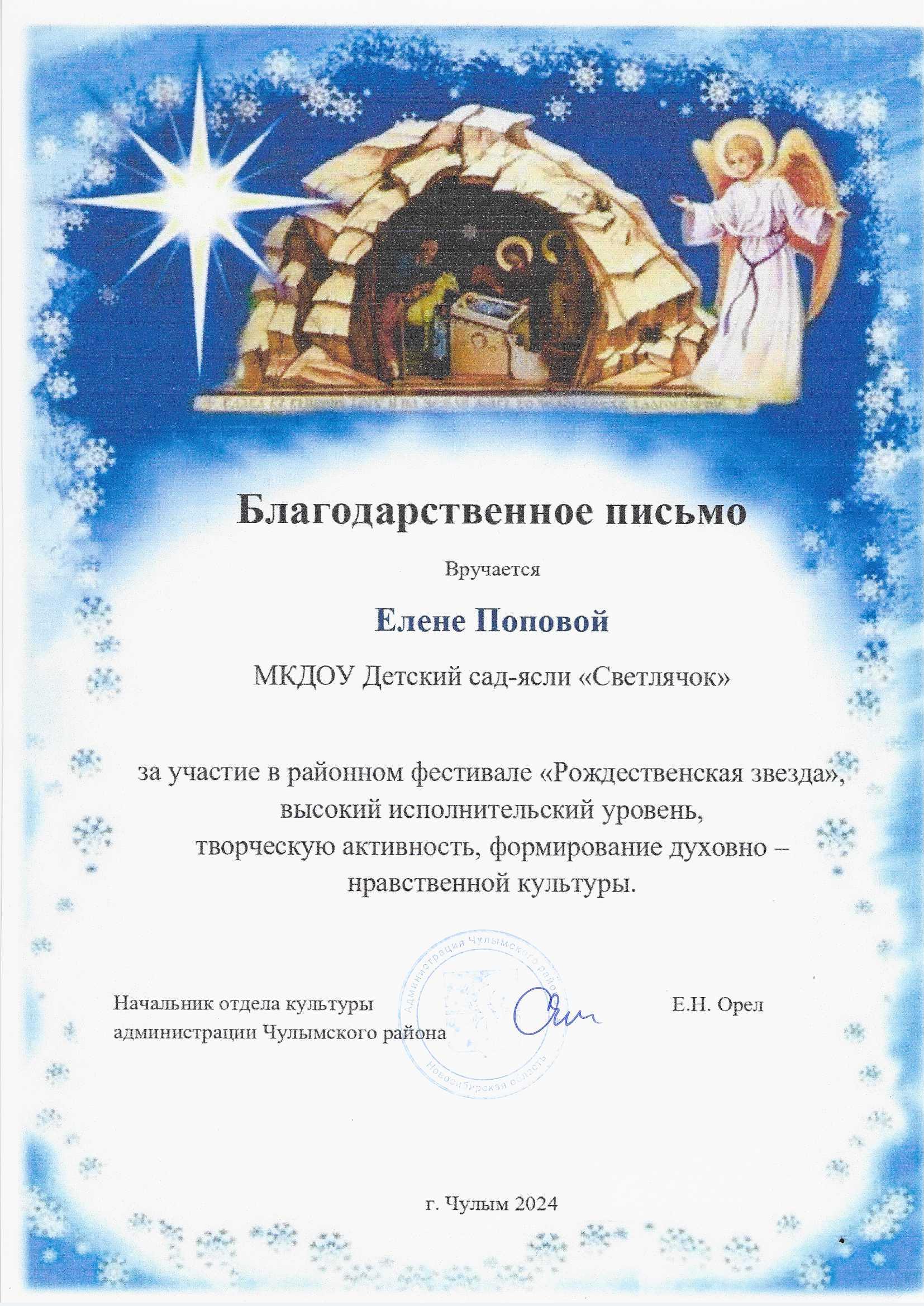 Благодарственное письмо за участие в районном фестивале "Рождественская звезда"