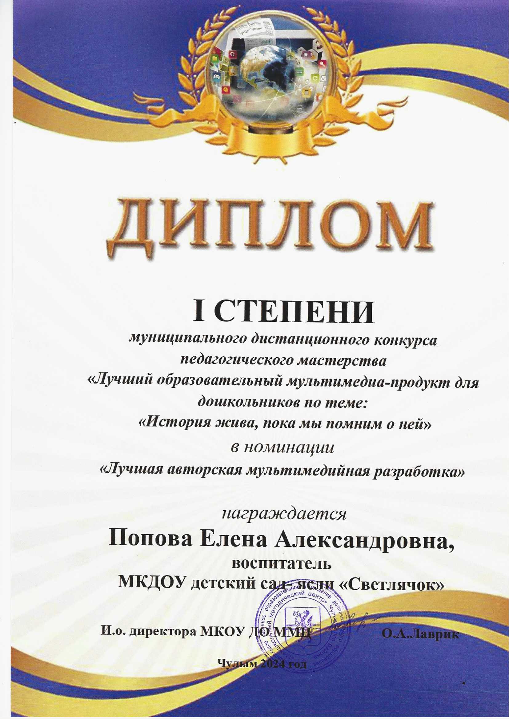 Диплом I степени муниципального дистанционного конкурса педагогического мастерства "Лучший образовательный мультимедиа-продукт для дошкольников по теме: "История жива, пока мы помним о ней" в номинации "Лучшая авторская мультимедийная разработка"