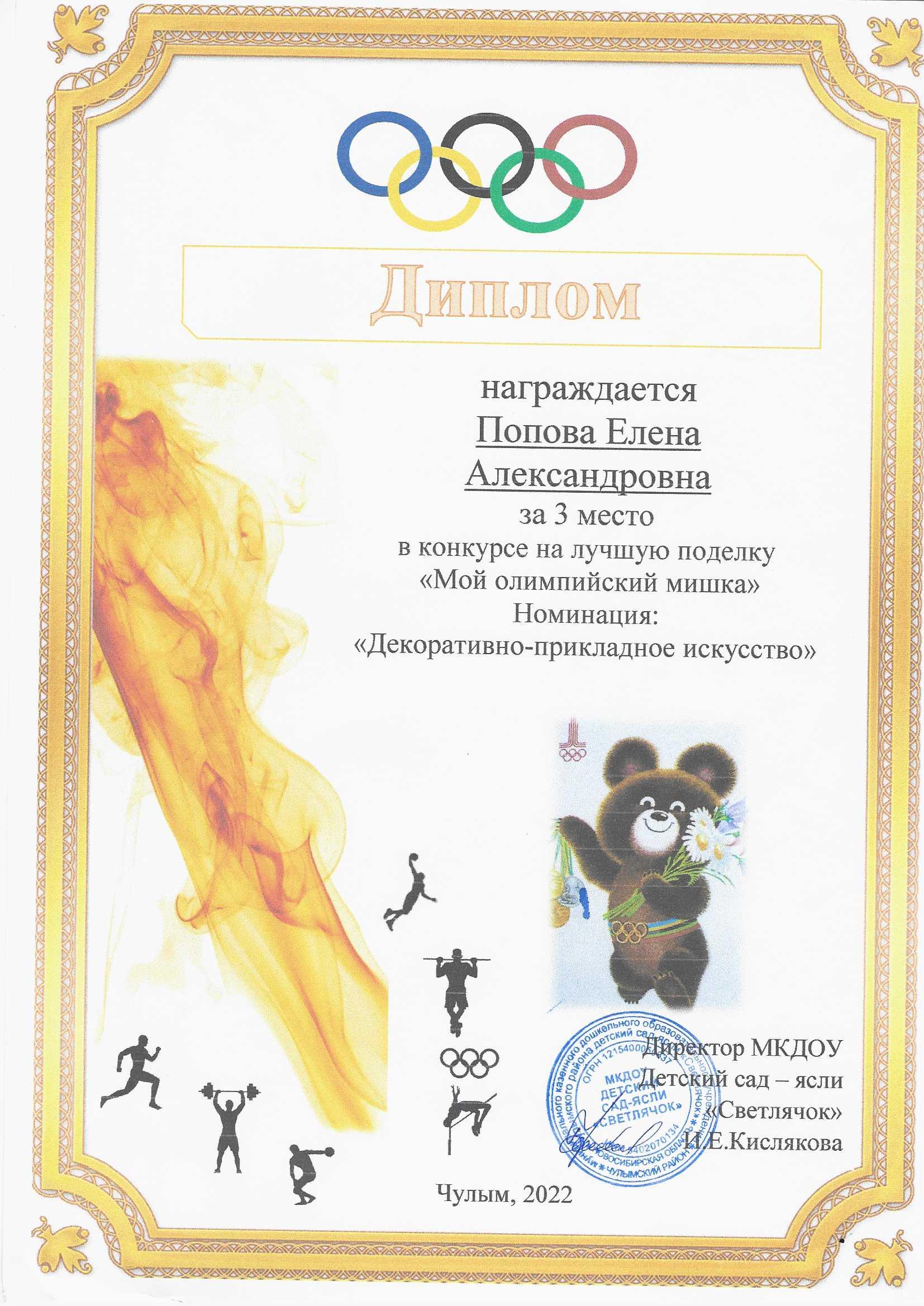 Диплом 3 место в конкурсе "Мой олимпийский мишка"