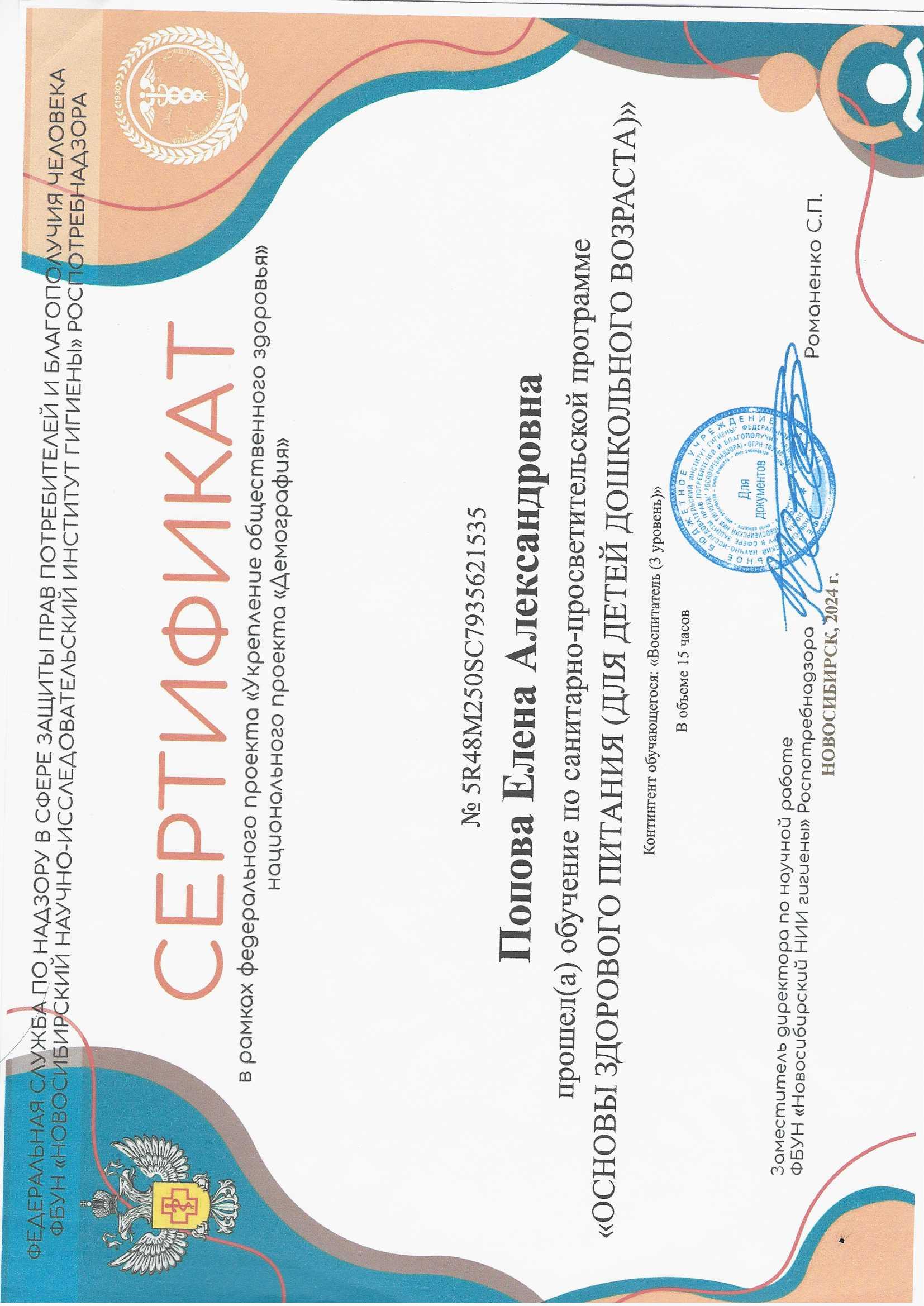 Сертификат обучение по санитарно-просветительской программе "Основы здорового питания"